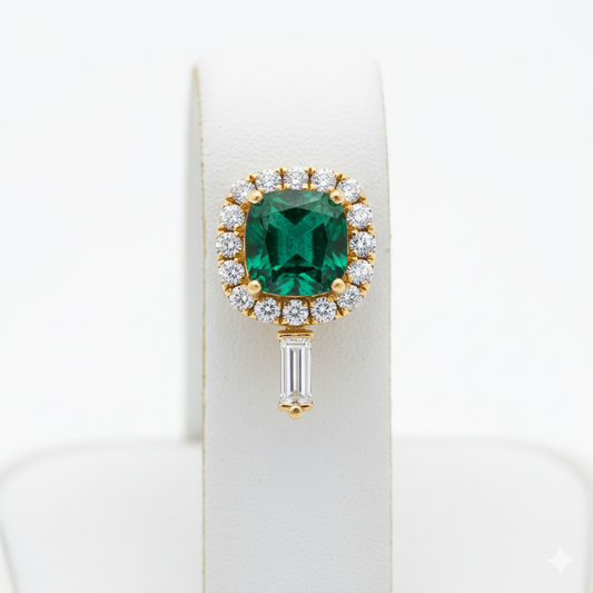 This stud earring features a striking cushion-cut green gemstone, likely an emerald, as its centerpiece....