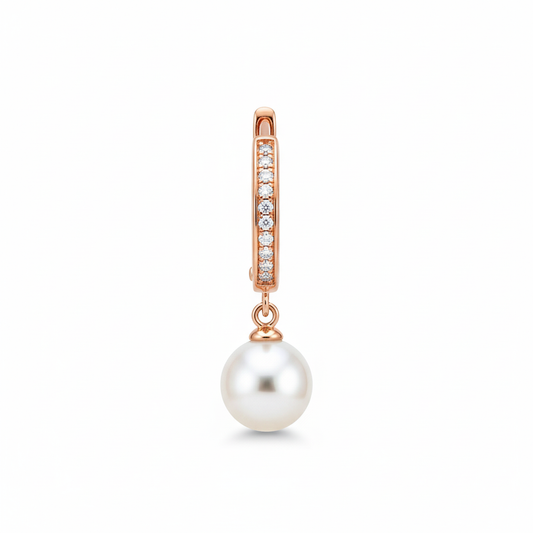 This elegant drop earring features a classic round white pearl, known for its smooth surface...