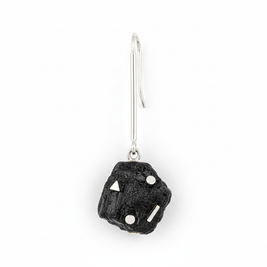 This unique dangle earring features a rustic, organically shaped nugget of black stone, possibly tourmaline...